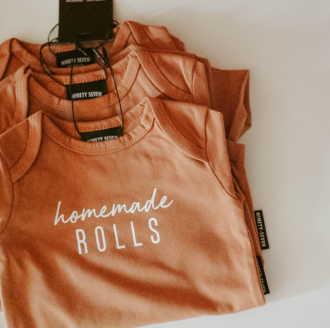 Celebrate your baby’s cuteness with our “Homemade Rolls” Baby Bodysuit. Order yours today and embrace those adorable curves!